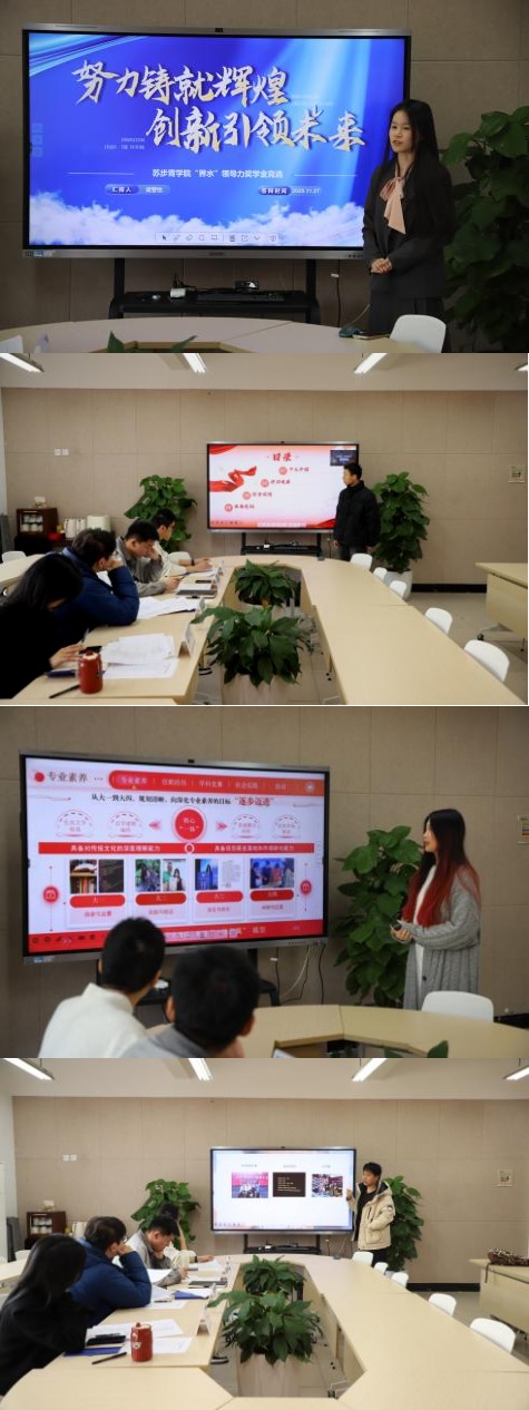 学院刘日胜、学工办李金伟、李承翼、竺梦婷老师、教学科蔡维雅老师;汇报人则是来自本院二、三年级的优秀学子,他们通过个人展示与现场答辩,全面展现了步青学子在学业成绩、综合素质和自我规划等方面的卓越风采。