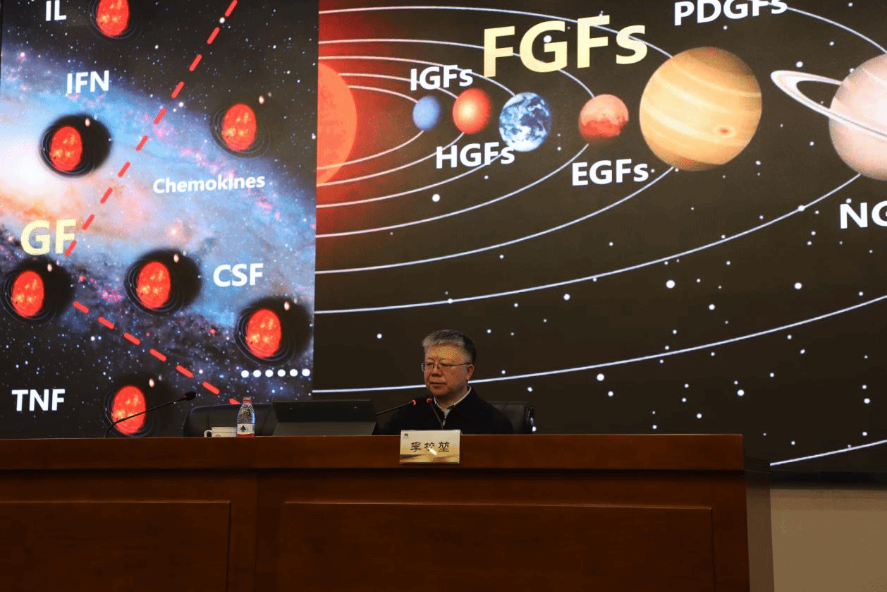 讲座中,李院士以生动形象的比喻,为同学们讲解了细胞生长因子的核心功能。他将这类物质比作人体内的“生命信使”,能够调控细胞增殖、组织修复与创面愈合,在烧伤恢复、慢性创面治疗等方面发挥着不可替代的作用。他还重点介绍了FGF家族的重要研究价值,用通俗易懂的语言阐释了其作用机制,让深奥的科学知识变得清晰易懂,使同学们真切感受到微观生命世界的精妙与神奇。