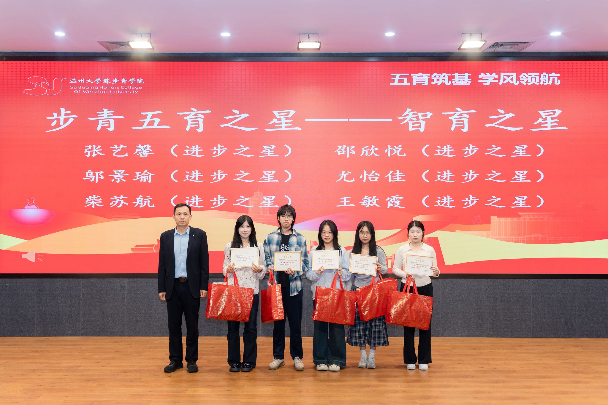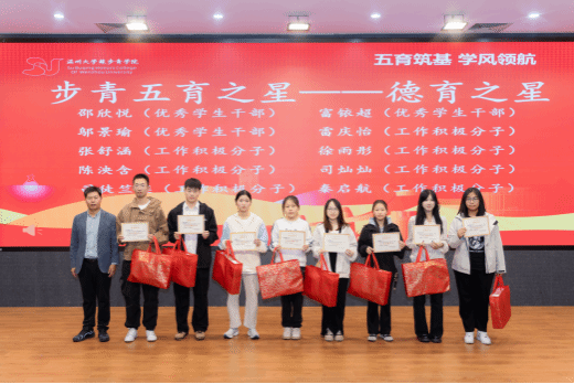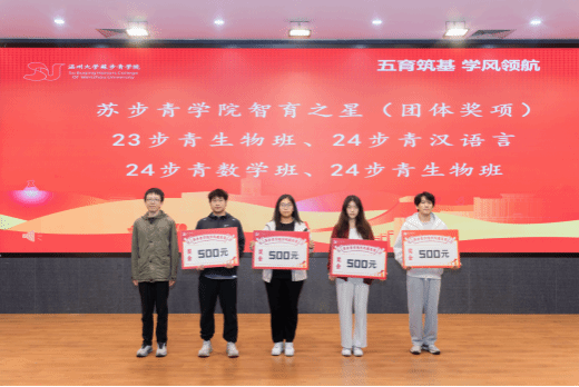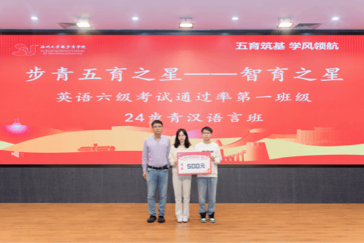 本次表彰大会共有五个议程,授予“德育之星,智育之星,体育之星,美育之星,劳育之星”五种奖项。在智育方面,除了个人奖,23步青生物班、24级步青汉语言班、24级步青数学班、24级步青生物班在期末考试中绩点达到预设目标,并获得专业学院排名第一的好成绩,特此为以上4个班级给予奖励。此外,24级步青汉语言班在本次英语六级考试中,通过率全院第一,特给予奖励。